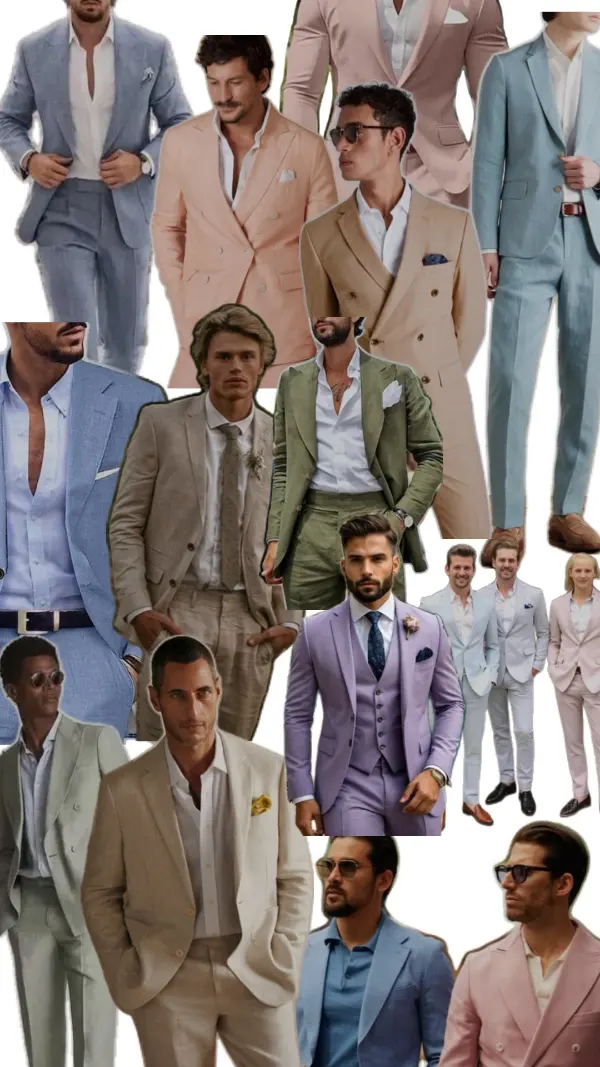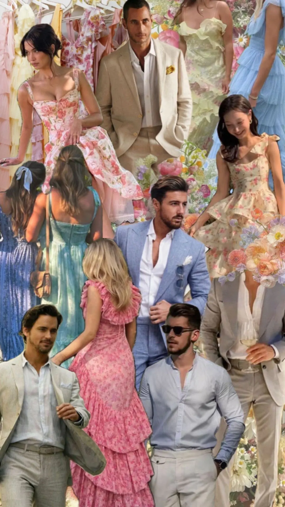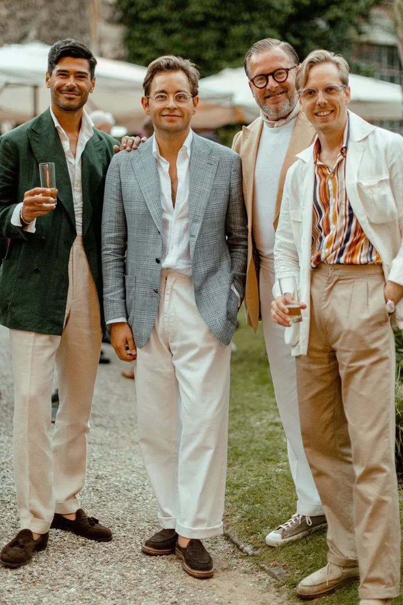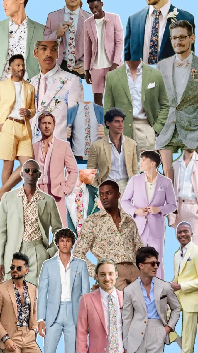 Die Herren dürfen sich in floralen Hemden, leichten Leinenstoffen, beigen Farben und